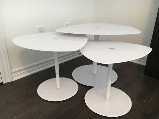 Mid Century Modern White Glass Tulip Accent Tables, set of 3, like new