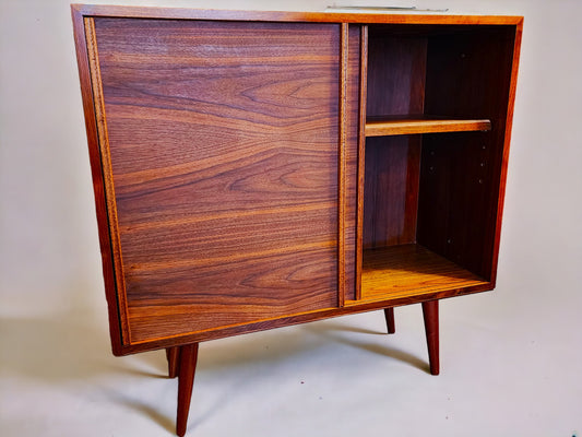 REFINISHED MCM walnut cabinet w sliding doors, narrow, fits records 37.5”