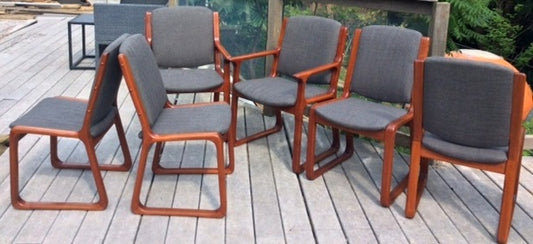 6 MCM Teak Chairs (2 arm, 4 side) Sleigh Base, REUPHOLSTERED, grey $199 each on Super Sale