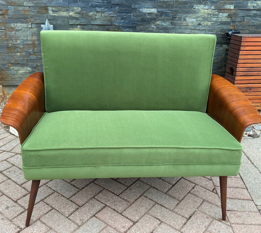 REFINISHED REUPHOLSTERED MCM Walnut Loveseat with Fan Arms by Frank and Son, Perfect