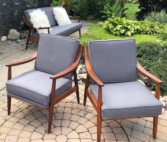 REFINISHED REUPHOLSTERED MCM Walnut Lounge Chairs Grey, each $599 (buy both or just one)