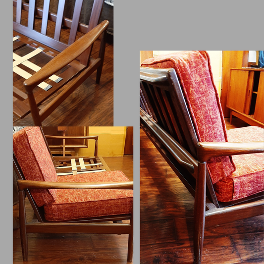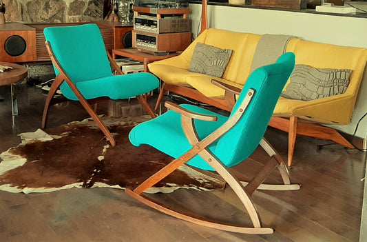 REFINISHED REUPHOLSTERED Set of MCM A- Frame Lounge Chair & Rocking Armchair, compact, PERFECT