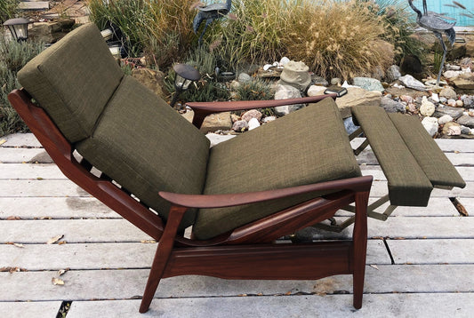 REFINISHED REUPHOLSTERED Solid Teak MCM High Back Lounge Chair Reclining, perfect