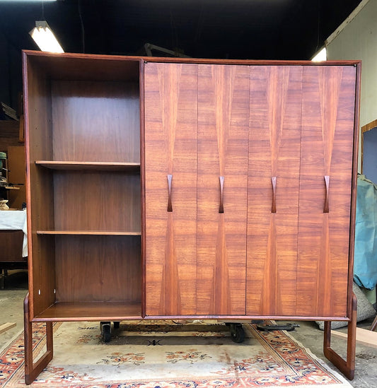 REFINISHED Unique Mid Century Modern Walnut Inlay Cabinet w Display 56", perfect