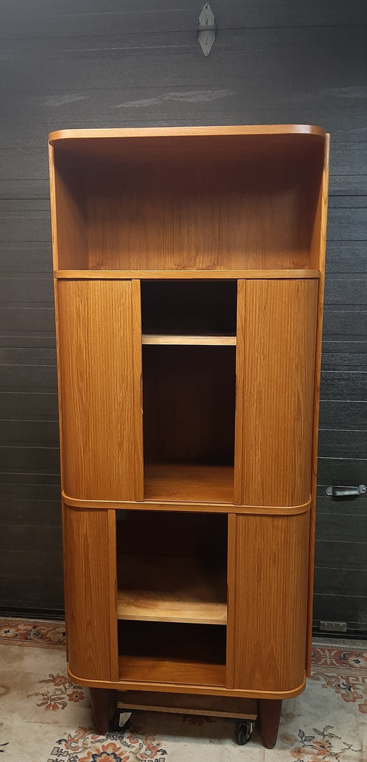 Restored Danish MCM Teak Tall Cabinet w Tambour Doors / Roll-Front, perfect