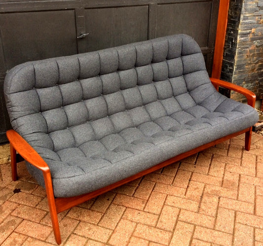 RESTORED Iconic Mid Century Modern Teak Sofa with arms - Scoop by Huber. Like New, Charcoal Wool Fabric