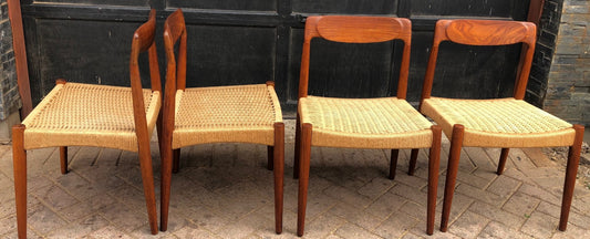 Coming soon ***4 Danish MCM Sculpted Teak and Cord Chairs, each $399