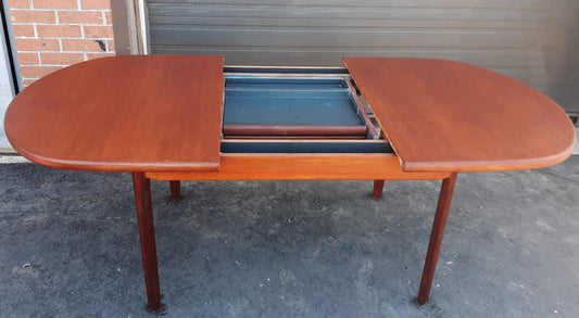 Coming soon***REFINISHED MCM Teak Table Oval Self-Storing w Butterfly Leaf 60"-80.5"