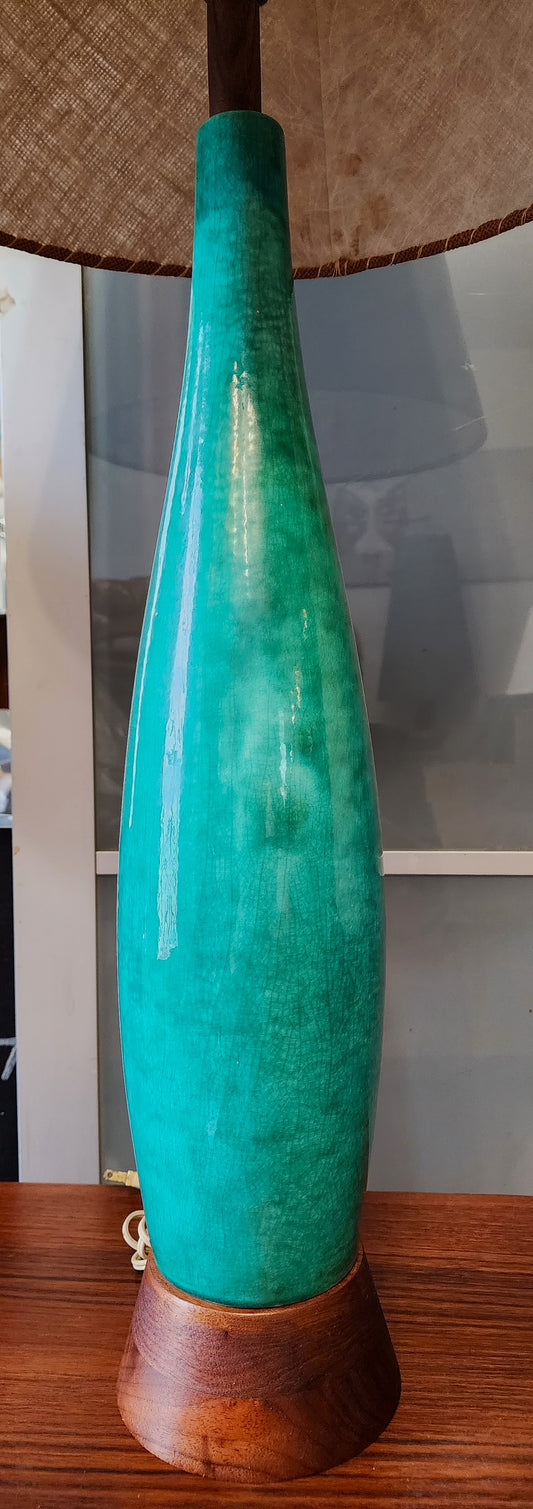 Mid Century Modern Green Teal Pottery & Teak Table Lamp 42.5"