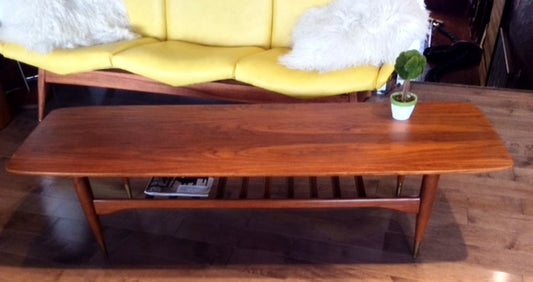 Mid Century Modern Walnut Coffee Table Surfboard with Shelf REFINISHED