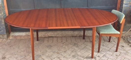 REFINISHED Danish MCM Teak Table Oval w 1 Leaf Self Storing 64"-84"