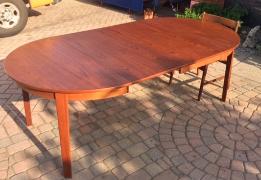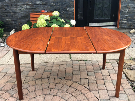 REFINISHED Danish MCM Teak Table Round to Oval w 2 Leaves 47-86"