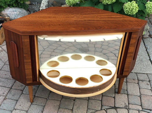 REFINISHED Danish MCM Teak Bar w Tambour Doors, perfect