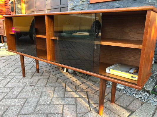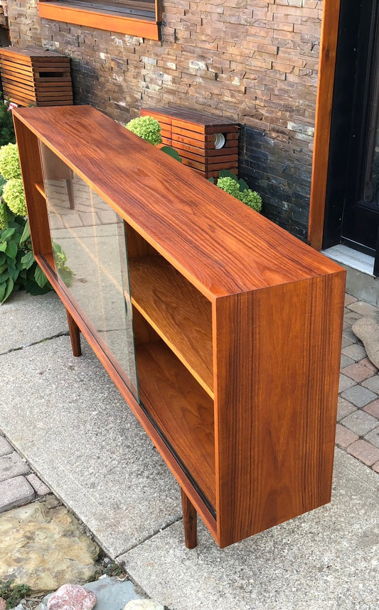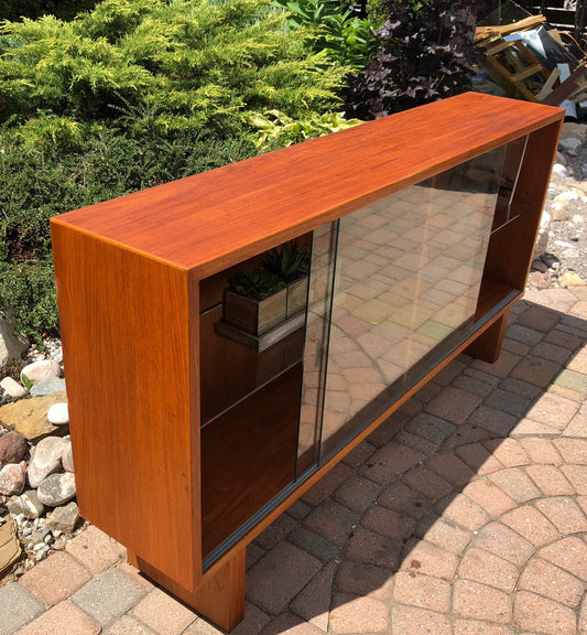 REFINISHED Danish MCM Teak Display China Console 62.5"w tinted glass doors