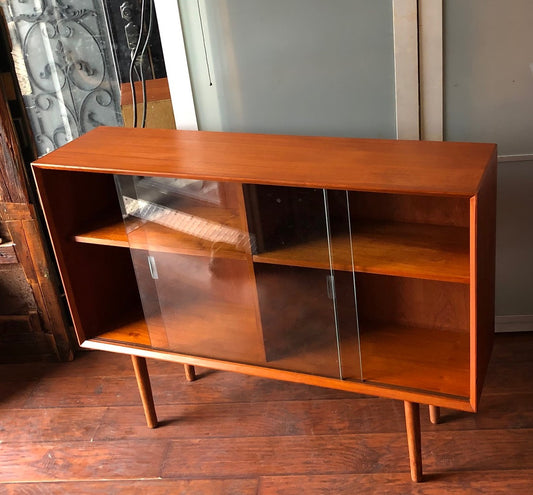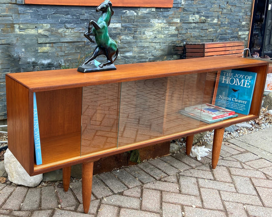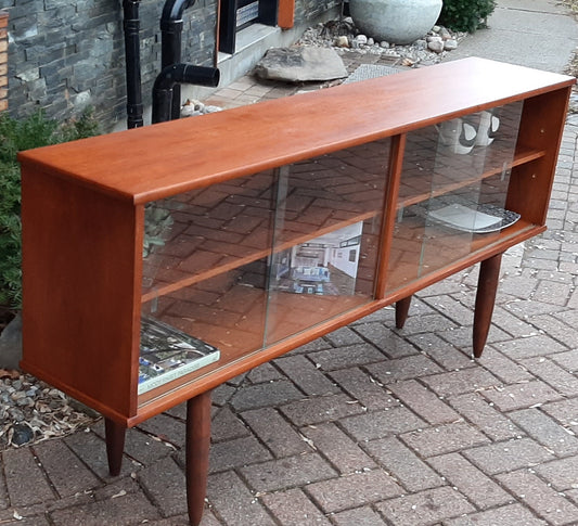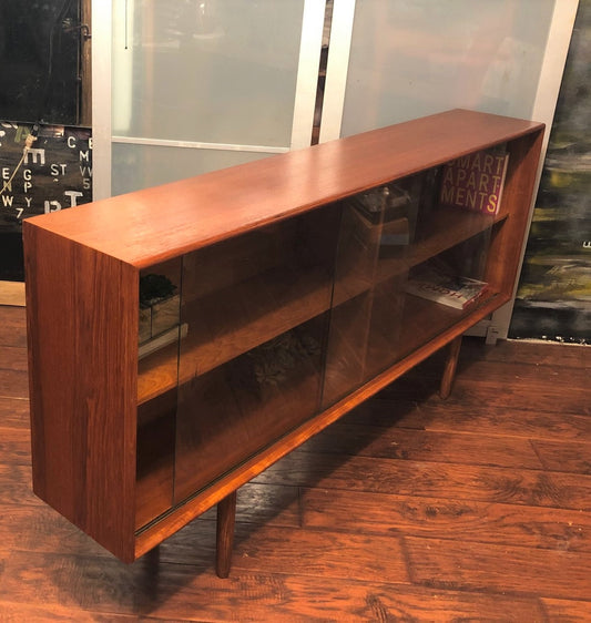 REFINISHED Danish MCM Teak Bookcase Display Media Console w sliding glass doors 63", PERFECT