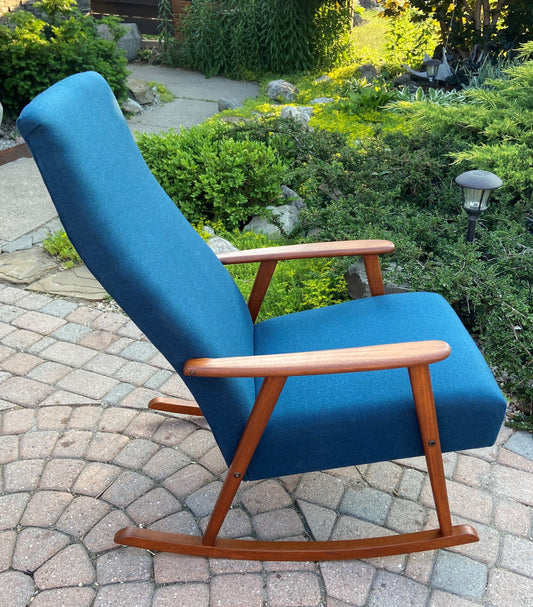 REFINISHED Danish Mid Century Modern Teak Rocking Chair NEW Wool Upholstery, Perfect