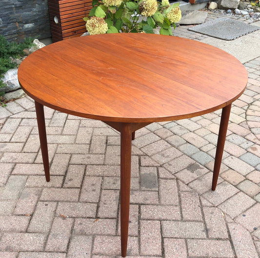 REFINISHED MCM Round to Oval Teak Table w 3 Leaves 41.5"-93" perfect