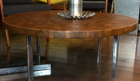 REFINISHED MCM Solid Teak Mosaic Coffee Table Chrome legs D 40", perfect