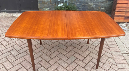 REFINISHED MCM Boat Shaped Teak Table Self storing w 2 Leaves by G. Bahus 63"-96"