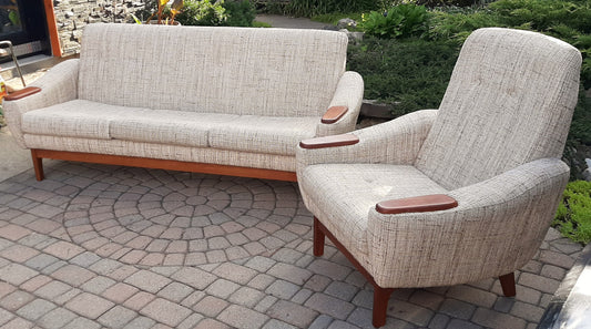 REFINISHED MCM Teak & Oatmeal Wool Sofa and Lounge Chair- Mint