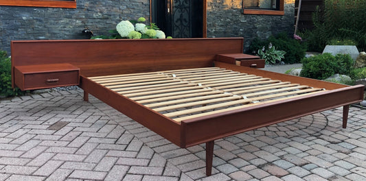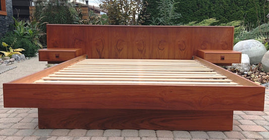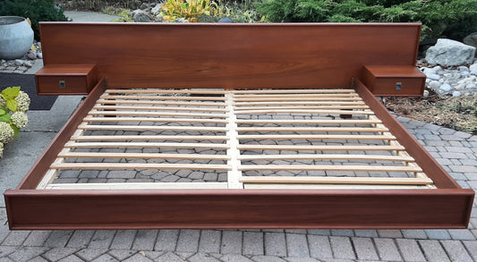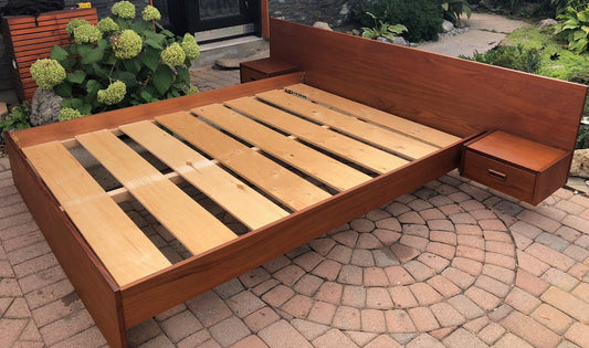 REFINISHED MCM Teak platform bed King size with floating night stands, PERFECT