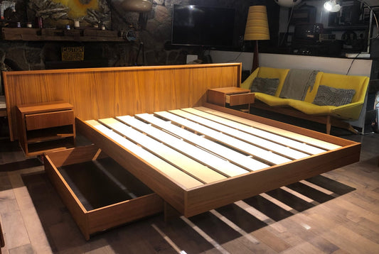 REFINISHED MCM Teak platform bed Queen with storage drawers, 2 night stands options, PERFECT
