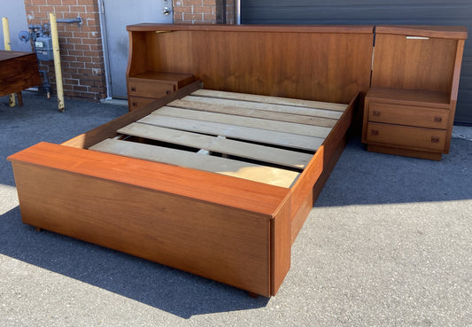 REFINISHED MCM Teak Queen Bed w Floating Nightstands & Storage Drawer
