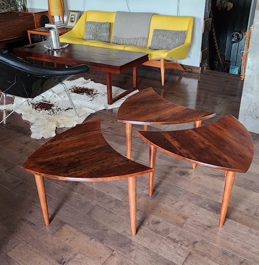 REFINISHED Mid Century Modern segmented triangular accent tables, set of 3