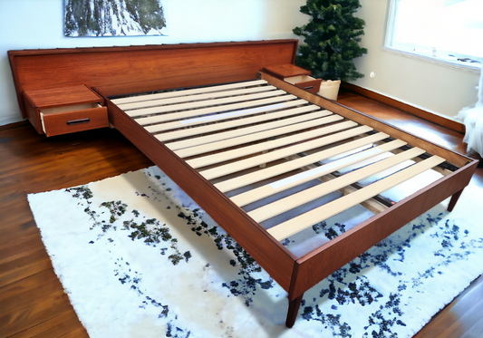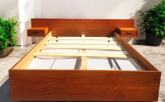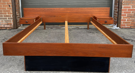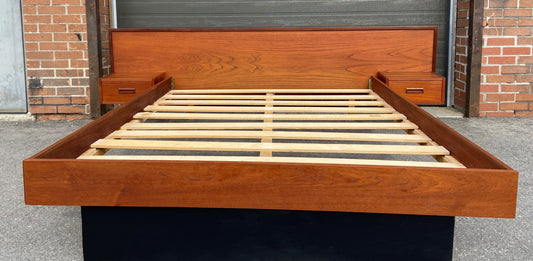 REFINISHED Mid Century Modern Teak Bed w Floating Nightstands Queen size