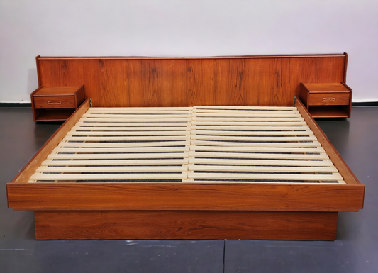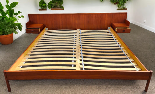REFINISHED Mid Century Modern Teak Bed King w Floating Bedside Tables