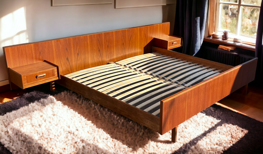 REFINISHED Mid Century Modern Teak Bed w floating nightstands Double