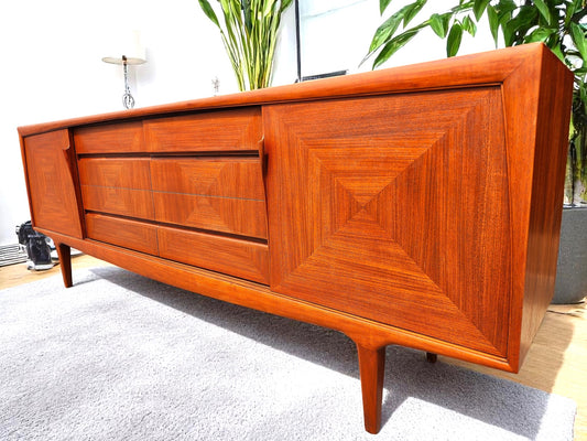 REFINISHED Mid Century Modern Teak Buffet w Geometrical Inlays & Lighting, 94"