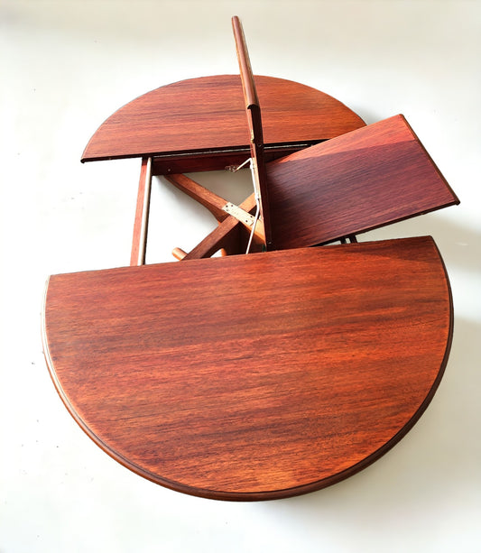 REFINISHED Mid Century Modern Teak Dining Table Round w Self Storing Leaf