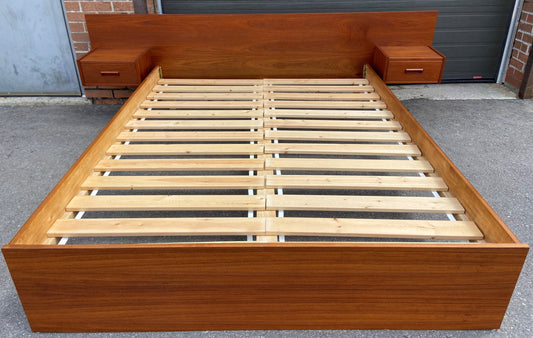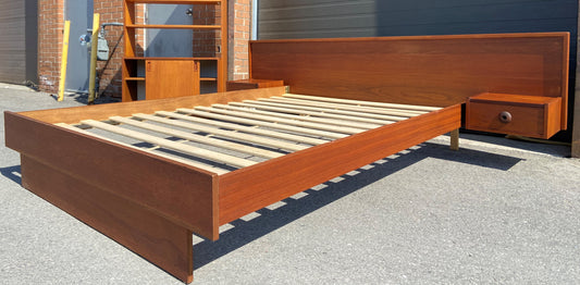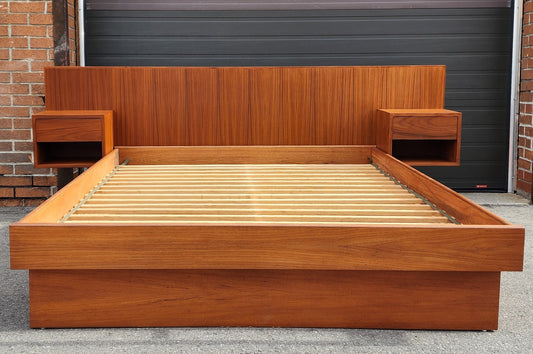 REFINISHED Mid Century Modern Teak Platform Bed w floating nightstands Queen, 2 slats options