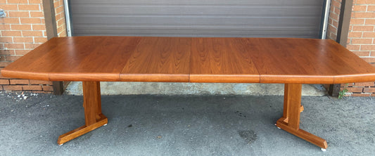 REFINISHED Mid Century Modern Teak Pedestal Table w 2 Leaves , 71.5"-112"