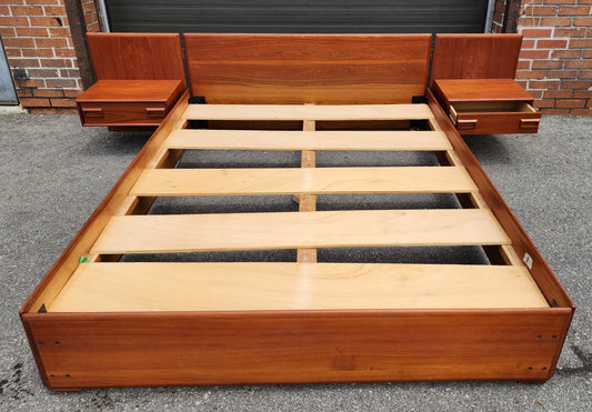 REFINISHED Mid Century Modern Teak Platform Bed Queen w Floating Nightstands