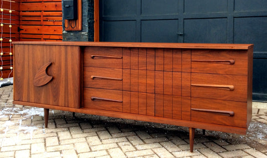 REFINISHED Mid Century Modern Teak or Walnut 9 Drawer Dresser Credenza Sideboard 3-Dimensional 7 ft