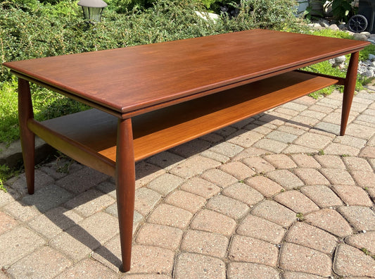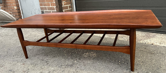 REFINISHED Mid Century Modern walnut coffee table w slatted shelf, 54"