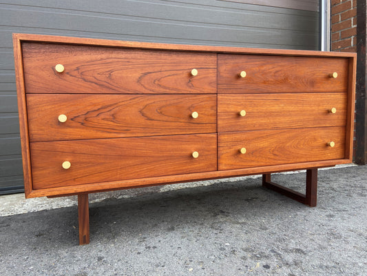 REFINISHED Mid Century Modern Walnut Dresser w 6 drawers brass knobs sledge base 54"