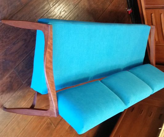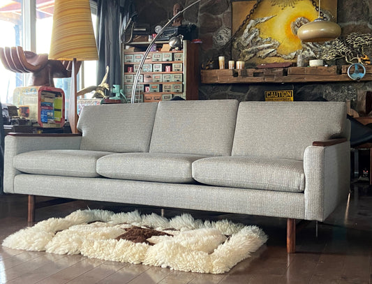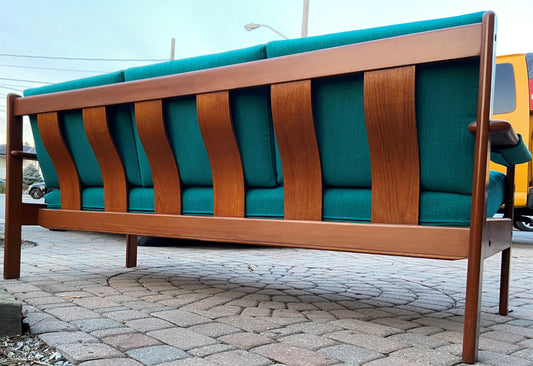 REFINISHED REUPHOLSTERED in Wool Mohair Danish Mid Century Modern Teak Sofa 93"