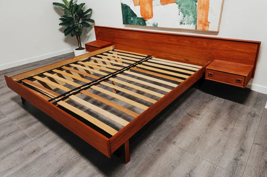 REFINISHED Mid Century Modern Teak Bed King w Floating Nightstands