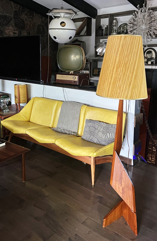 Mid Century Modern Teak Floor Lamp with Built-In Tripod Table, REFINISHED