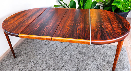 REFINISHED Danish Mid Century Modern Rio Rosewood Table Round to Oval 2 Leaves by H. Kjaernulf 47"-86"