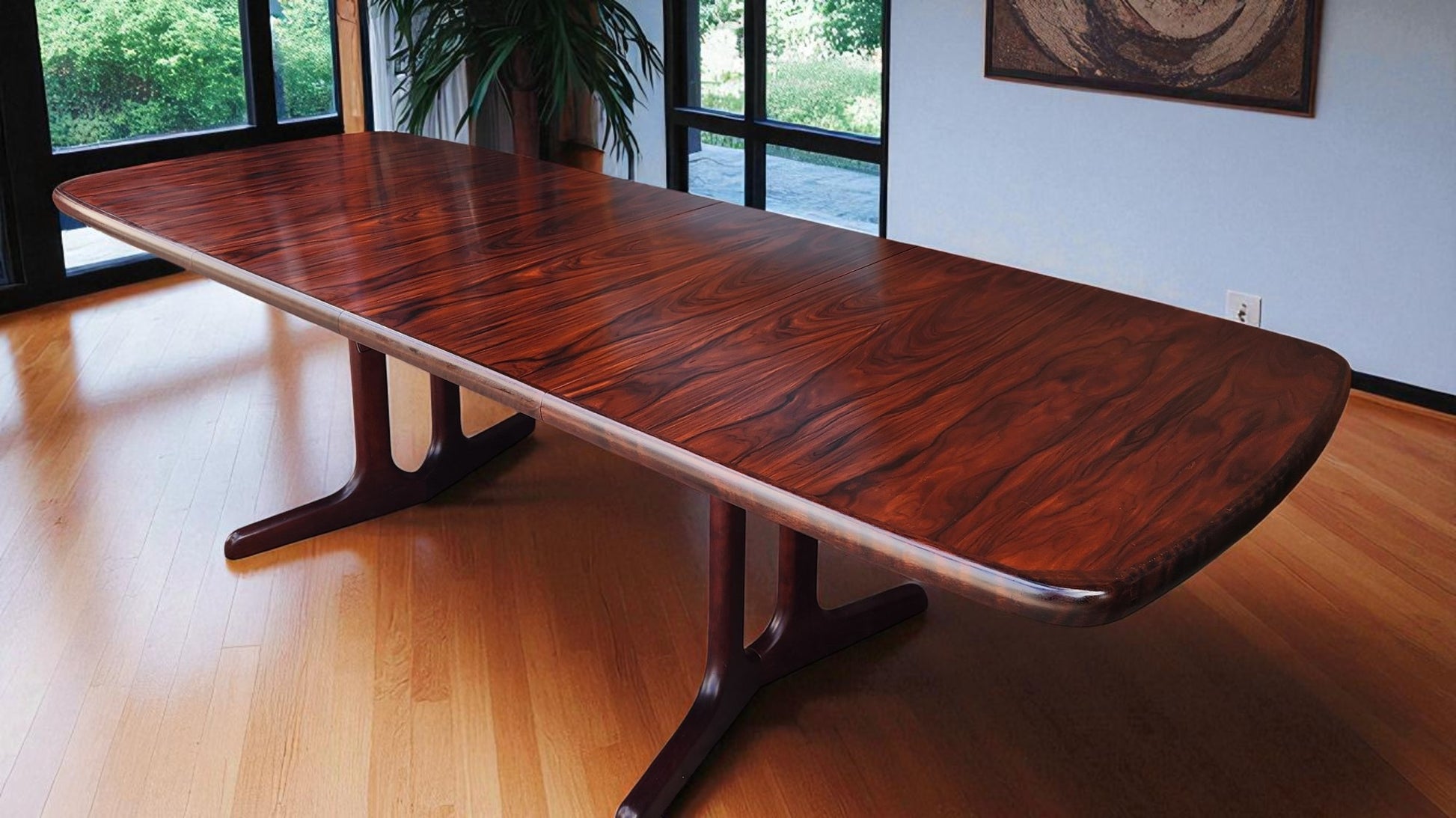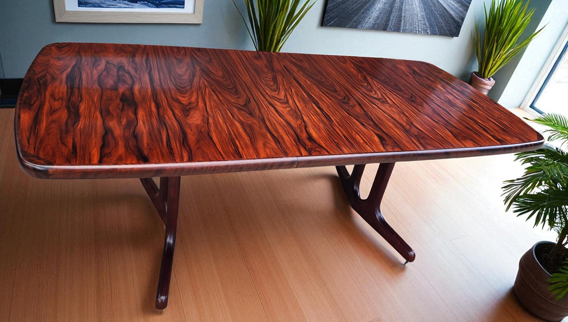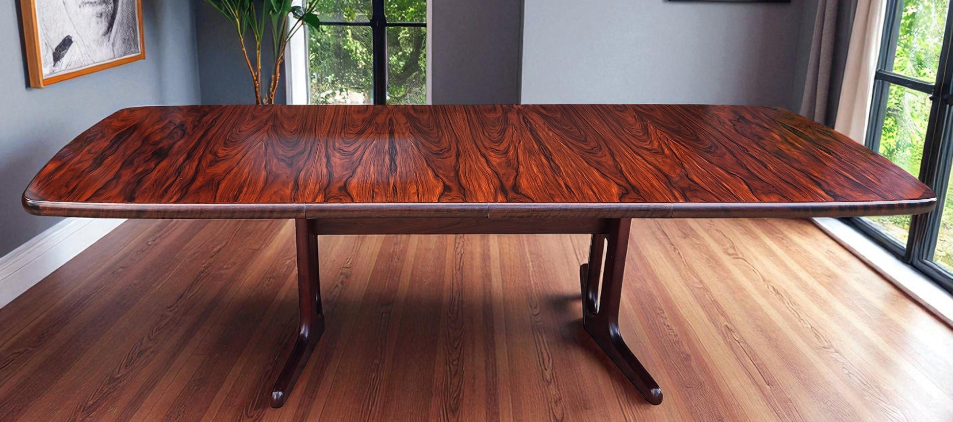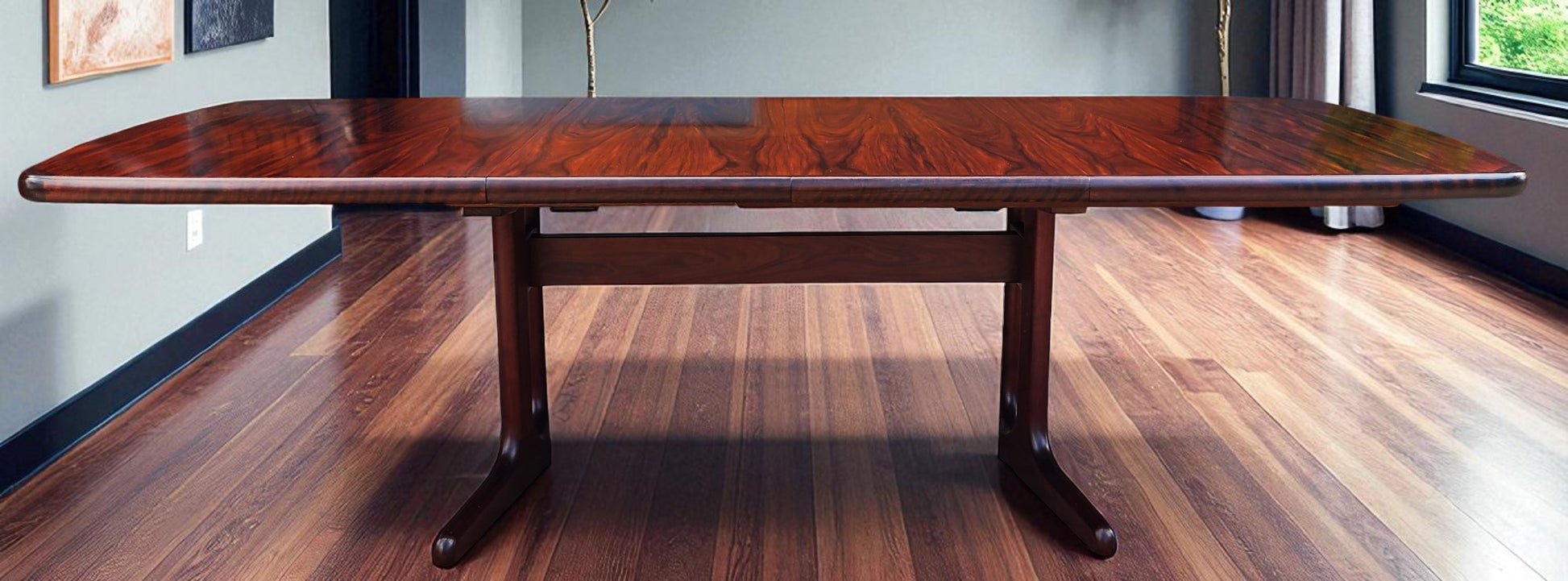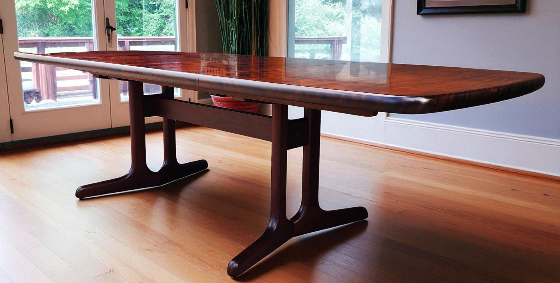 For sale, we have this splendid large Danish Mid Century Modern rosewood dining table with 2 extension leaves by Ansager Mobler. Especially strong and sturdy, it features beautiful rosewood grain and sculptural trestle legs. The leaves can be stored inside of the table when not needed.