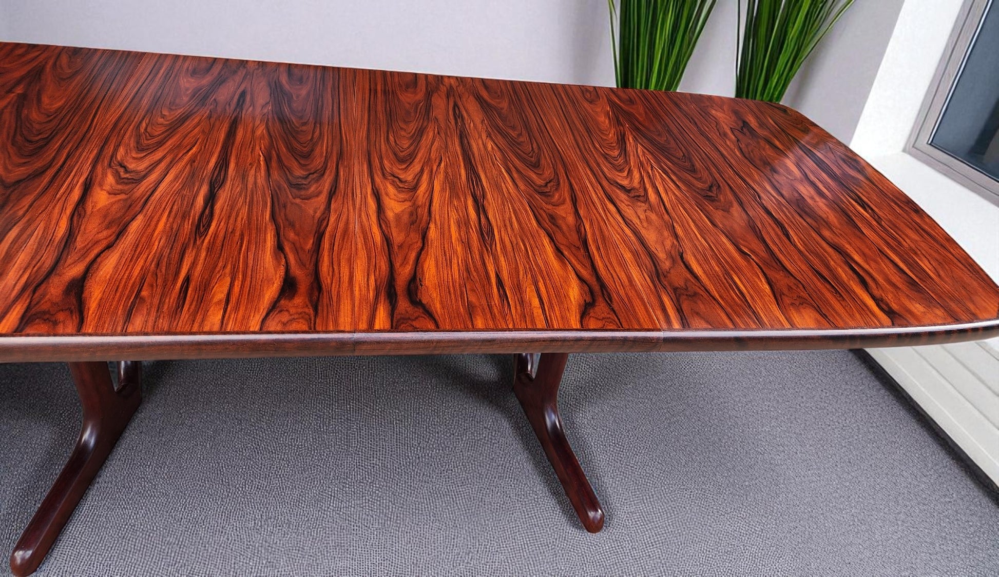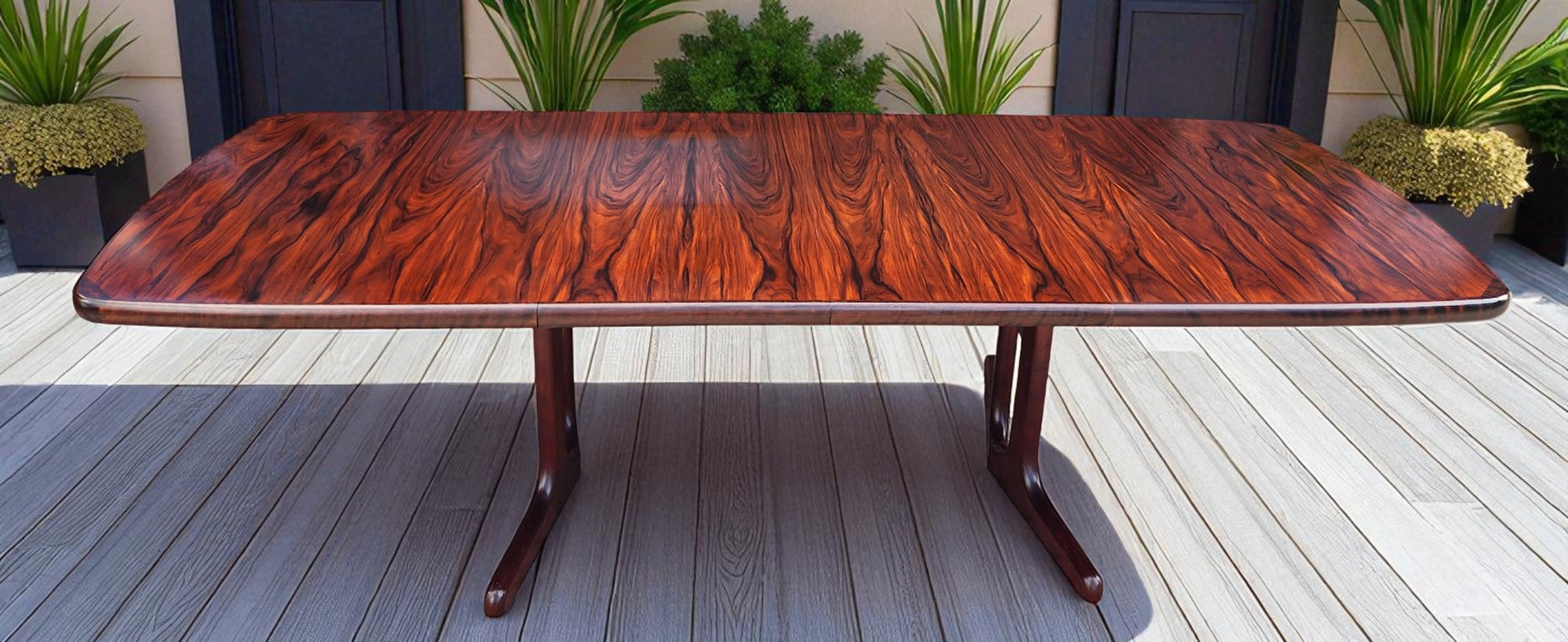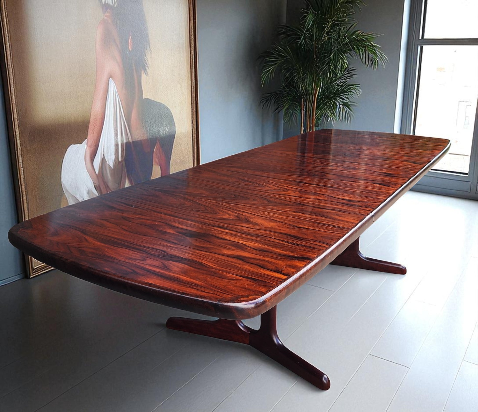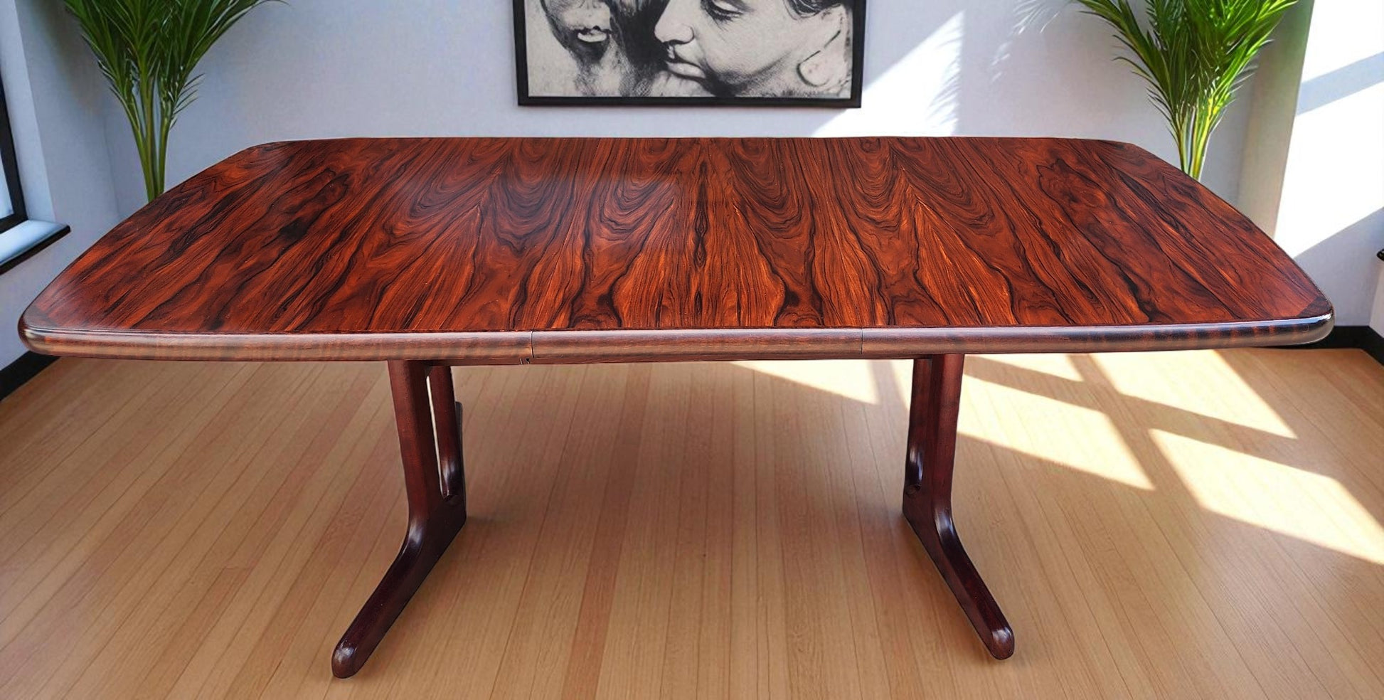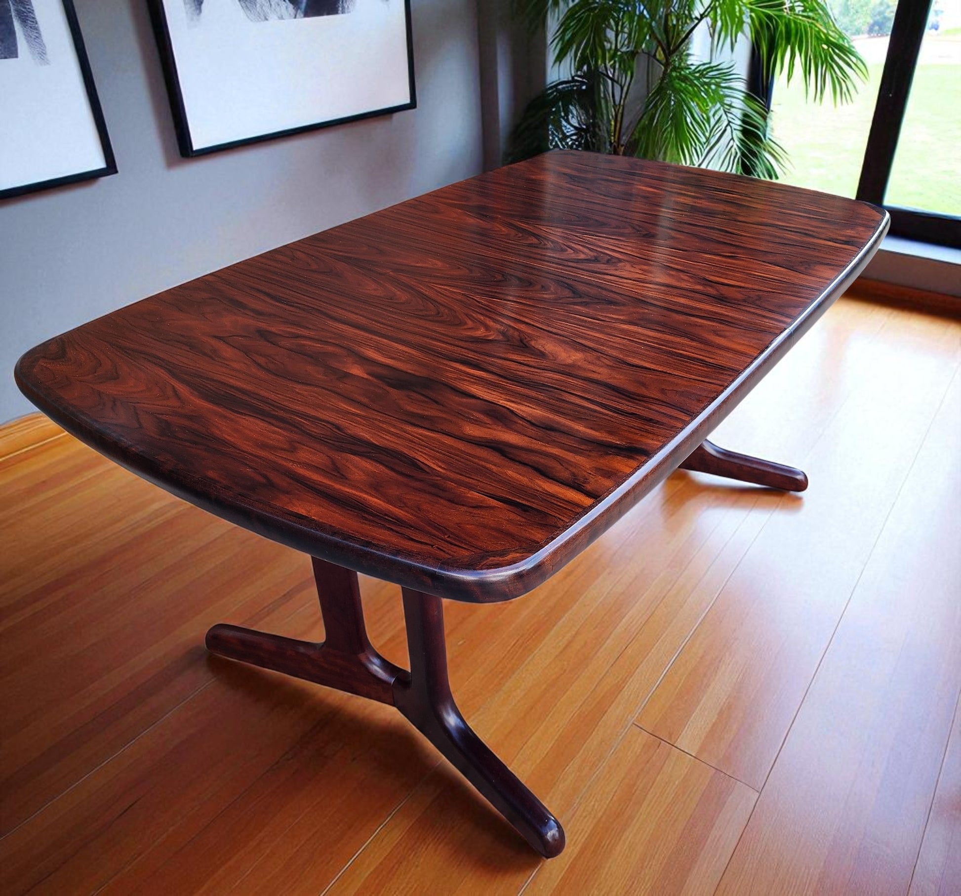 For sale, we have this splendid large Danish Mid Century Modern rosewood dining table with 2 extension leaves by Ansager Mobler. Especially strong and sturdy, it features beautiful rosewood grain and sculptural trestle legs. The leaves can be stored inside of the table when not needed.