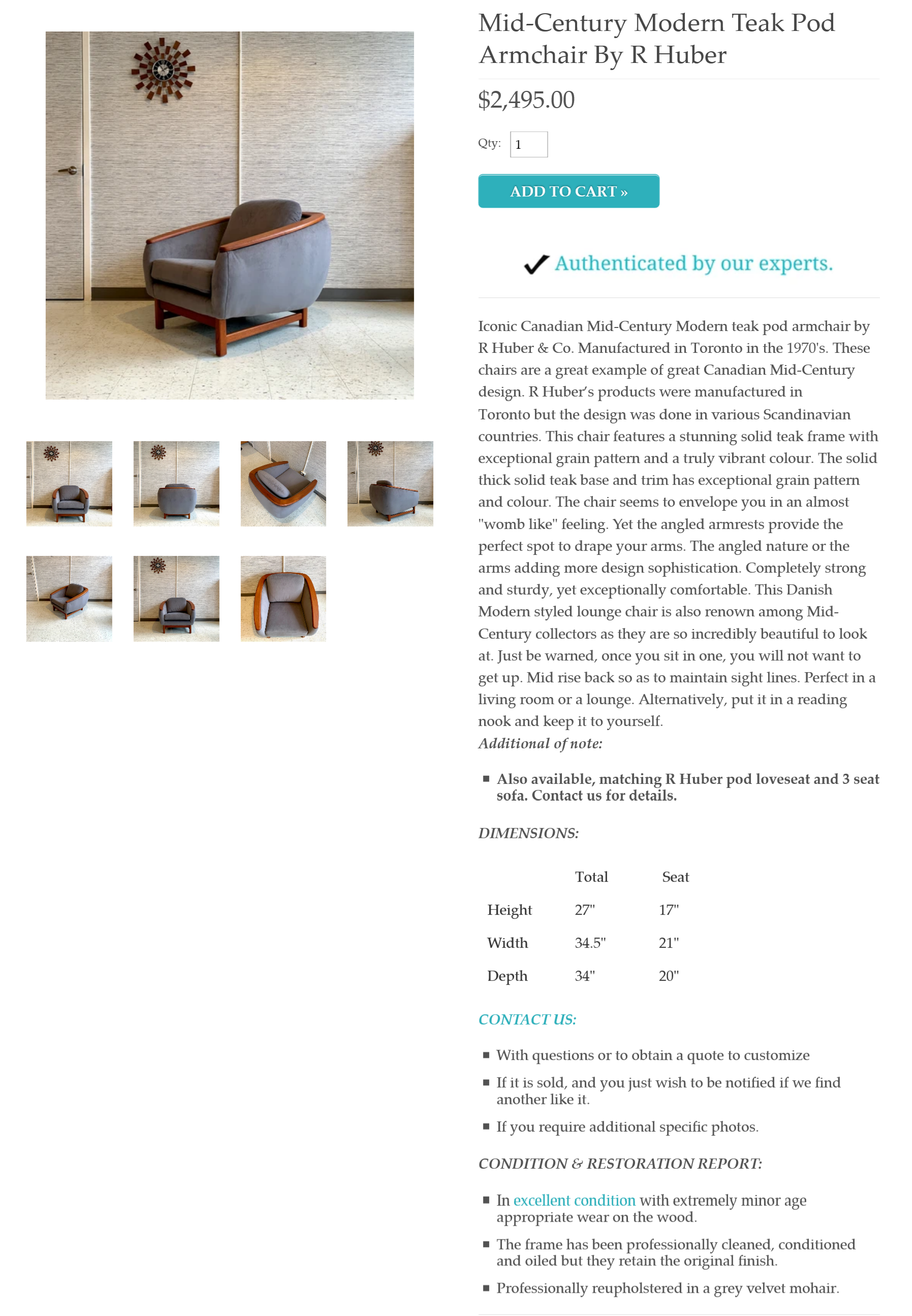 If you are looking for high quality armchair that would be long lasting, beautiful to look at and very comfortable to sit, please check this highly desirable Mid Century Modern teak upholstered lounge armchair with a sculptural curved back by R. Huber & Co., 1968. We love the swooping thick teak band that surrounds the top edge and armrests as well as sturdy teak base and hardwood frame. Organic shape with graceful rounded backs and long sloping teak arms. We love the deep barrel backs surrounded by a handsome thick teak band. The sturdy teak legs are also quite stylish.