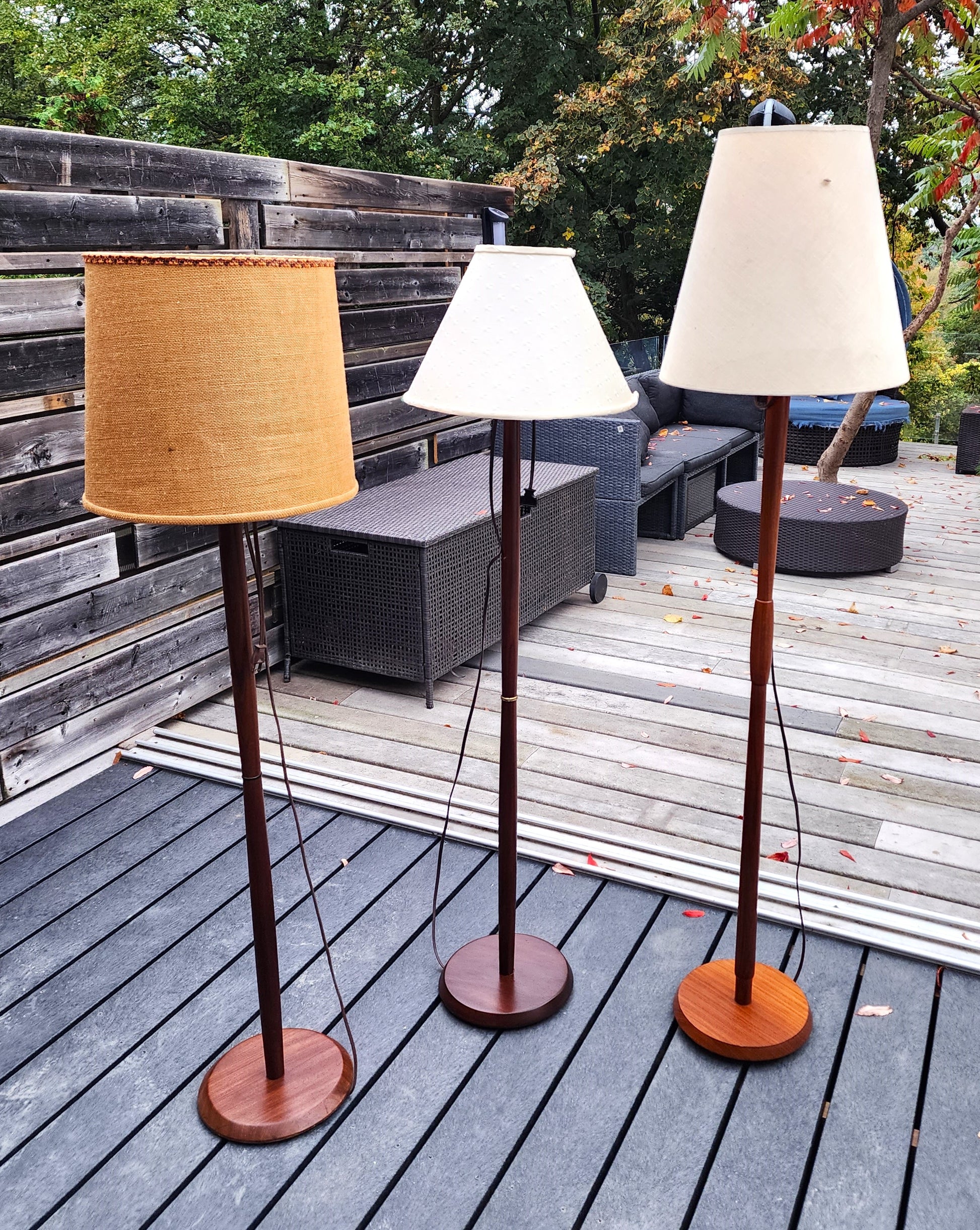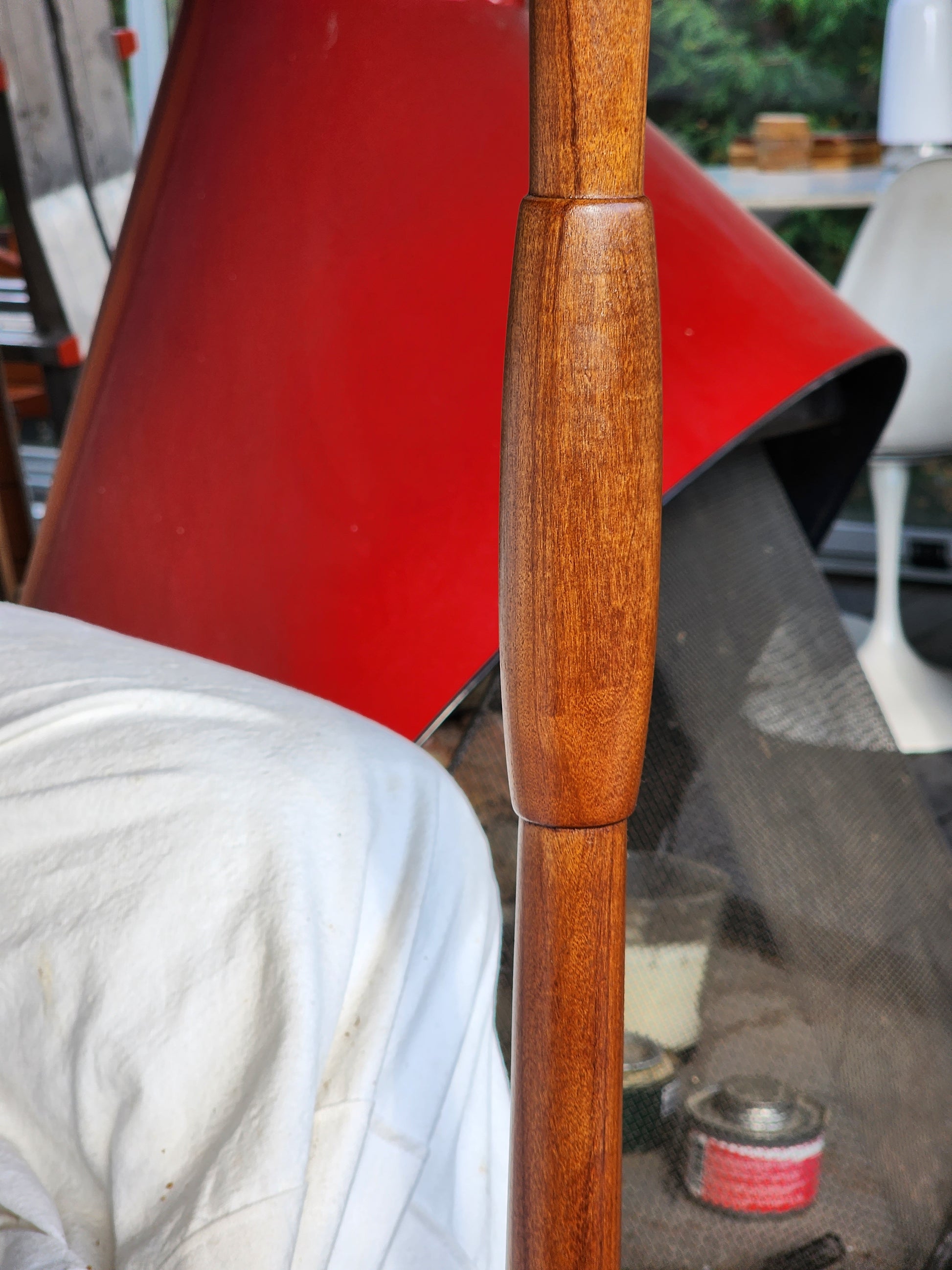 The teak parts have been refinished. The shade is in great vintage condition with some very slight staining. The lamp is solid and sturdy, yet open and streamlined.