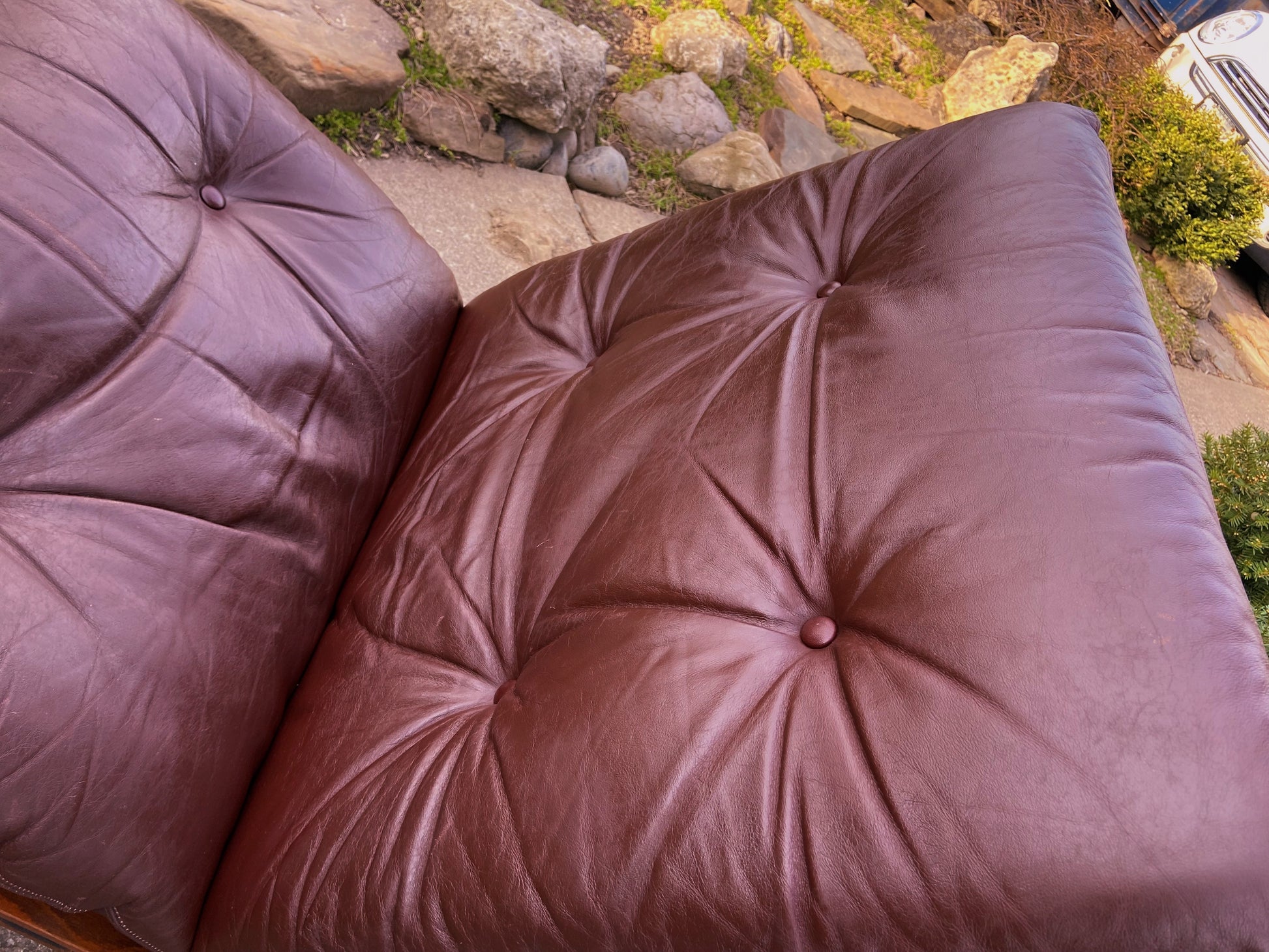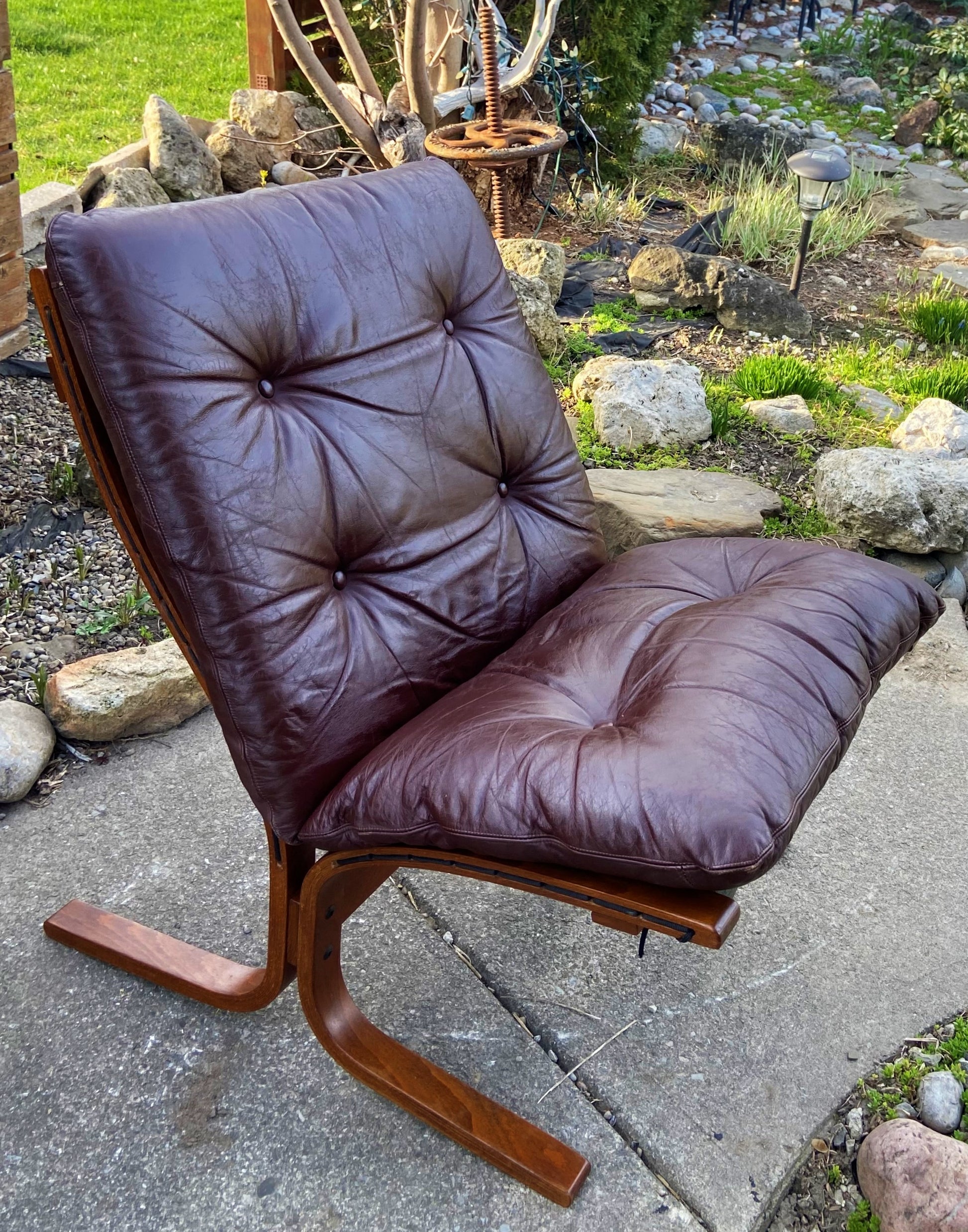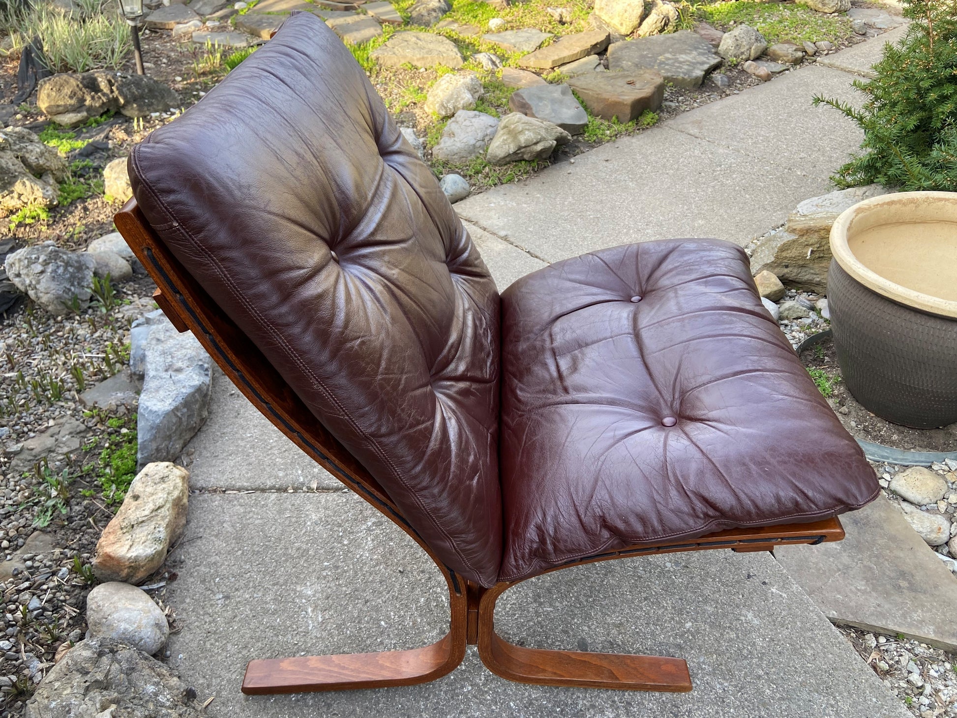 Siesta is a Scandinavian classic featuring frame made of stained plywood and strong canvas that supports comfortable buttoned wine color leather cushions. Beautiful workmanship details such as the leather stitching, the layers of wood visible on the sides, the leather buttons, and the lacing and eyelets are characteristic of this design. The chair is famous for its comfort.