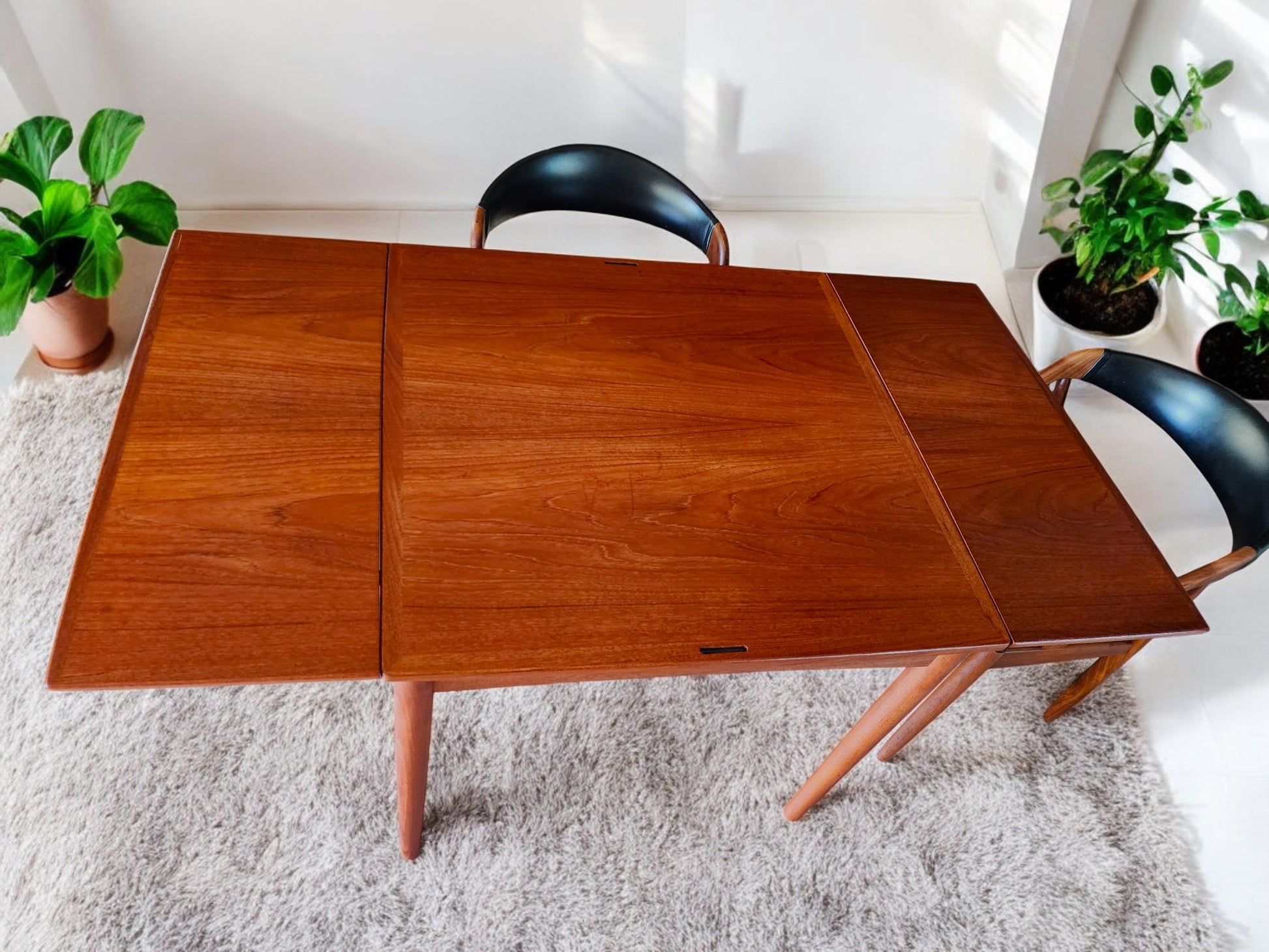 For sale, we have this wonderful vintage gem- Danish Mid Century Modern extendable draw leaf/pocket leaf teak dining or games table designed by Carlo Jensen and made by Poul Hundevad, Denmark.