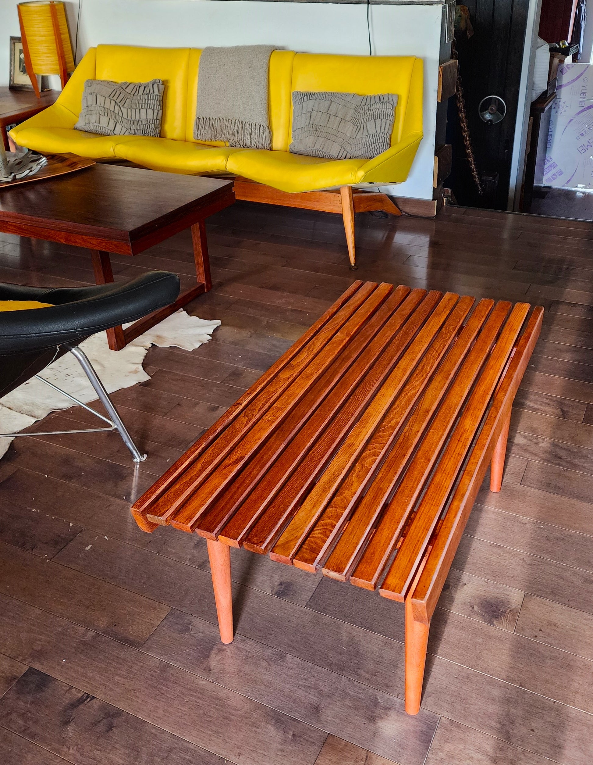 For sale, we have this vintage Mid Century Modern slatted coffee table or bench with angled edges and tapered legs. We are working on another bench if you are looking for the pair of them.